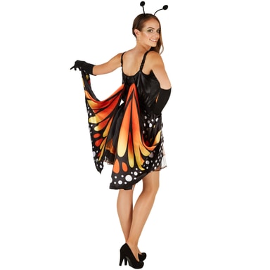 Maskeraddräkt Fjäril kärrguldvinge består av en korsettliknande klänning, stora vingar, långa handskar och ett hårband med känselspröt, material: 100 % polyester.