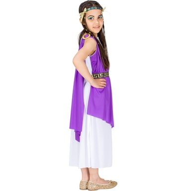 Maskeraddräkten grekisk gudinna Athena består av en vacker lång klänning i lager-på-lager-stil med ett påsytt lila band och underbar brodyr i brokadstil. På axelbandet finns ett underbart gyllene spänne i antikt utseende. I leveransomfattningen ingår även ett matchande, påkostat utformat, elastiskt hårband, material: 100 % polyester.