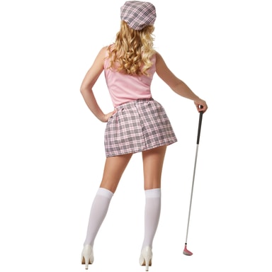 Maskeraddräkt en golfare för damer består av en kort kjol i klassisk rutig stil, en ärmlös blus med V-ringning och golfklubbslogga och en ledig skärmmössa. Kjolen har en dragkedja baktill, resår i sidorna och tre påsydda knappar fram. Blusen har ett sportigt snitt. Denna sportiga outfit rundas av med en rutig skärmmössa. Material: 100 % polyester.
