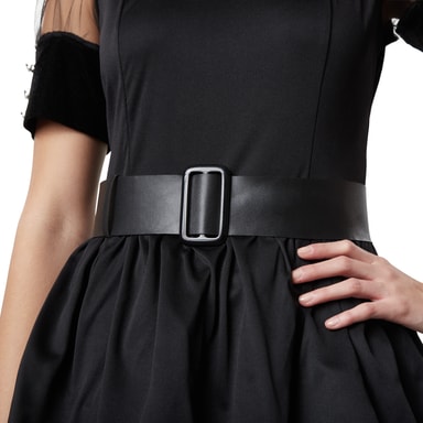En slående detalj är det matchande bältet med sitt distinkta spänne, som framhäver din midja och säkerställer en smickrande passform. Designen förstärks ytterligare av snygga dekorativa knappar på halsringningen, ärmarna och häxhatten.