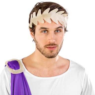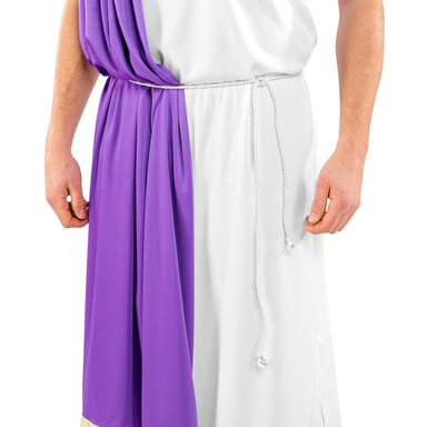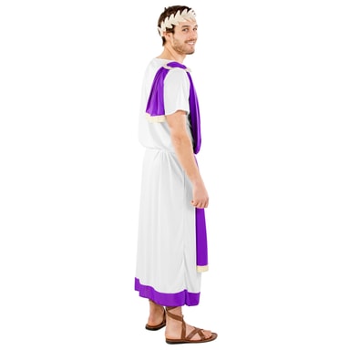 Maskeraddräkt Kejsare Marcus Aurelius består av en vit toga av elastisk jersey, med lila fåll och en hållare på axeln för sjalen, en elastisk lagerkrans och en snodd som skärp. Sjalen har brodyr med speciellt brokadmönster, material: 100 % polyester.