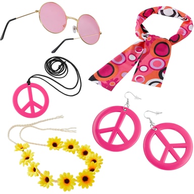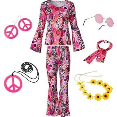 Dyka in i den färgglada världen av 70-talet och låt andan av fred,kärlek och frihet återuppstå! Med damkostymen Hippie Flowerpower blir du stjärnan på varje maskerad- eller temafest. Kostymen inkluderar en rosa topp och matchande byxor i typisk flowerpower-design, som ger ett glatt och livfullt intryck. Looken kompletteras med många accessoarer som solglasögon,örhängen,halsband och blomband – så utstrålar du ren hippie-energi!