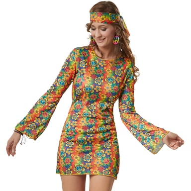 Maskeraddräkten består av en kort färgglad klänning med blommönster, peace-tecken och smileys. De långa ärmarna avslutas i trumpetform. Över detta bärs en mockaliknande ärmlös väst med långa ärmar. Klänningens mönster återkommer i pannbandet som knyts ihop, material: 100 % polyester.