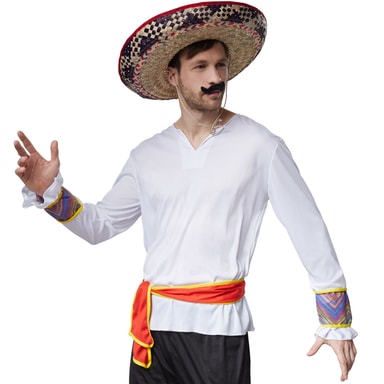 Herrdräkten Juan, den eldige mexikanen, består av en blus, en väst samt ett knytskärp. Den vita blusen har V-ringning och lång ärm. I höjd med handleden finns färgglada, breda applikationer. Den ärmlösa västen i traditionellt mönster med snörning har en påsydd krage med bård och tofsar. Framtill på västfållen finns en påsydd dekorbård med fransar. Det röda knytskärpet har en gul kant, material: 100 % polyester.