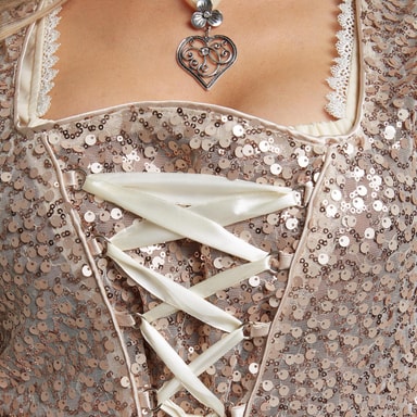 Den skräddarsydda dirndln imponerar med sitt skimrande utseende och eleganta glitterelement. Paljettdekorationen på överdelen ger klänningen en lyxig touch, medan den fina snörningen med filigranöglor inte bara ger en elegant accent utan också säkerställer en perfekt passform. Det feminina snittet smickrar figuren och skapar en vacker silhuett.
