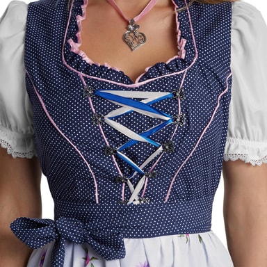 I den vackert skurna Mini-Dirndl Garching är det dags för rejäla firanden! Den korta klänningen är mörkblå med vita prickar och rosa detaljer. Den vackra snörningen har filigranöglor med strass genom vilka två fina band loopar. Halsringningen framhävs av volanger, liksom slutet av den korta kjolen. En harmonisk kontrast till klänningen är förklädet i ljusa färger, som är särskilt bra med sitt vackra blommotiv, material: 100% bomull.