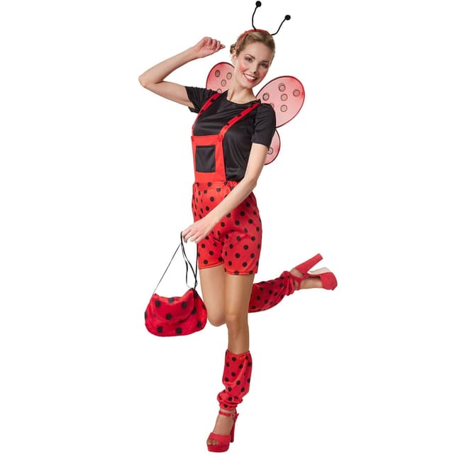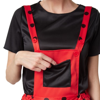 Damdräkten Marina nyckelpiga består av hängslebyxor, t-shirt, benvärmare och diadem. Hängslebyxorna har knäppning, är röda med svarta prickar och har resår samt en stor, svart bröstficka. Den kortärmade t-shirten är också svart. De röda benvärmarna har resår och samma svarta prickiga mönster som byxorna. Det röda diademet med svarta känselspröt gör dräkten komplett, material: 100 % polyester.