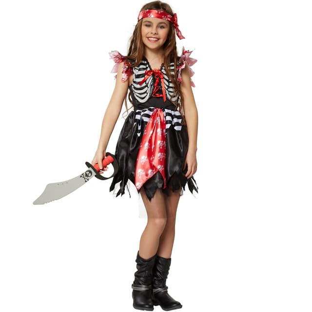 Skepp ohoj! Den här piratprinsessan är inte att leka med. Det syns tydligt med alla dödskallar på den figursydda klänningen med uddigt snitt och bandanan. I fråga om vildhet är den här söta sjörövaren inte det minsta sämre än de stora piraterna.