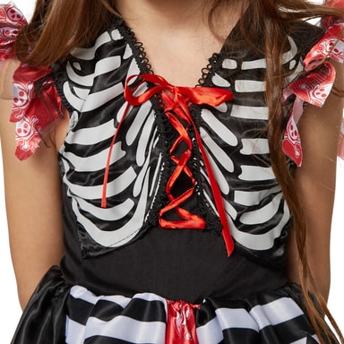 Maskeraddräkten Pirat Prinsessa för flickor består av en klänning med korta spetsärmar av tyll och en påsydd väst med skelettmönster. Samt är klänningen dekorerad med spets och snörning. Kjolen består av glansigt tyg i flera lager och tyll med uddigt snitt i ändarna. Utklädnaden är också utrustad med en bandana för att göra dräkten fulländad. Material: 100 % polyester.