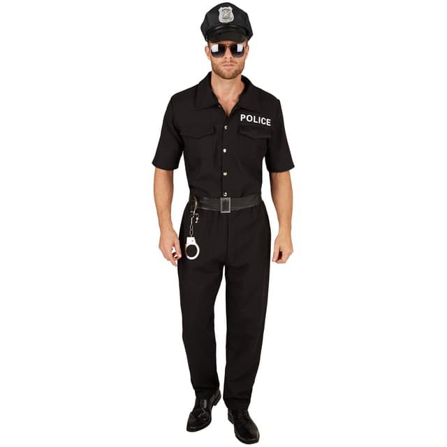 Herrdräkten polis består av en kortärmad skjorta, bekväma byxor, ett läderbälte med konstläderliknande utseende och handfängsel, material: 100 % polyester.