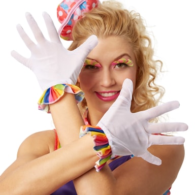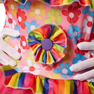 Maskeraddräkten popstjärna från 80-talet består av en ärmlös tyllklänning, en matchande liten hatt med hårspänne och vackra näthandskar i vitt. Den övre delen av klänningen är tillverkad av ett blommigt tyg med påsydda blommor. Nedtill övergår klänningen i tyll i flera lager och har en smidig underkjol. En matchande fluga rundar av den vackra maskeraddräkten, material: 100 % polyester.