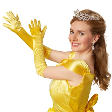 Denna maskeraddräkt består av en high-low-klänning med axelband i sidenlook med fastsydda tyllager med spets. Den utställda formen får klänningen tack vare en isydd underkjol med tyllkanter. Två påsydda små korgar med volanger förstärker dekolletaget hos den åtsittande stretch-överdelen. De långa satinhandskarna rundar av denna gula dröm. Dragkedja bak, material: 100 % polyester.