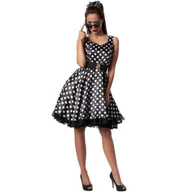 Damdräkten Rockabilly Lady består av en prickig axelbandsklänning av glänsande tyg. Bältet med resår och vackert bearbetat spänne förstärker den figursydda formen och får kostymen att se uppdelad ut i en övre och en undre del. Kjolen har en påsydd fåll av spets, de båda underkjolarna är av satin och tyll, material: 100 % polyester.