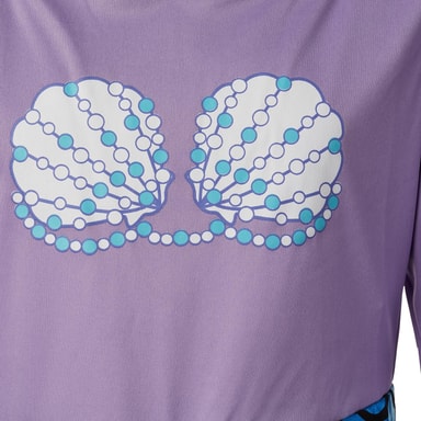 Den enhetliga outfiten utmärker sig med en sagolik kjol med fjällmönster, som skimrar vackert och perfekt efterliknar illusionen av fiskfjäll. De omsorgsfullt utformade volangerna och de glittrande paljetterna ger kjoldelen en magisk glans. Den utsvängda tyllkjoldelen ger en lekfull lätthet och ger kostymen en elegant touch. Den långärmade överdelen med pärl- och snäckapplikationer kompletterar den förtrollande looken och ger kostymen en sagolik utstrålning.