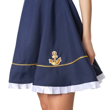 En speciell höjdpunkt är den generösa, volangformade halsringningen med en dekorativ tygrosett, vilket ger en lekfull touch till dräkten. Kjolen är prydd med snygga knappar, en ankarlapp och fina volanger, vilket perfekt kompletterar den nautiska designen och ger dräkten ett autentiskt utseende.