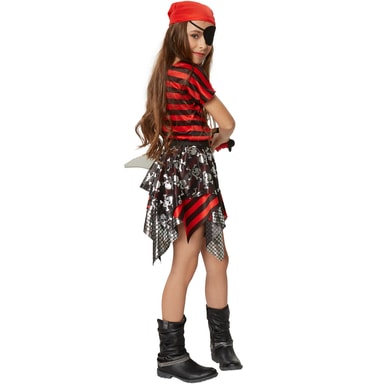 Maskeraddräkten Liten sjörövare består av en kortärmad överdel med svarta och röda ränder. En kjol i tre lager med uddigt snitt i ändarna samt en röd huvudbonad. Material: 100 % polyester.