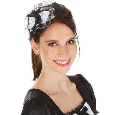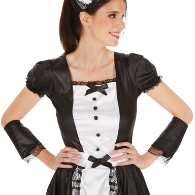 Den utmanande maskeraddräkt består av en förtjusande, förförisk klänning i svart och vitt. Klänningen är kort och trollar fram ett fantastiskt dekolletage. Till maskeraddräkten medföljer ett vackert diadem, snygga strumpor och handledsvärmare, material: 100 % polyester.