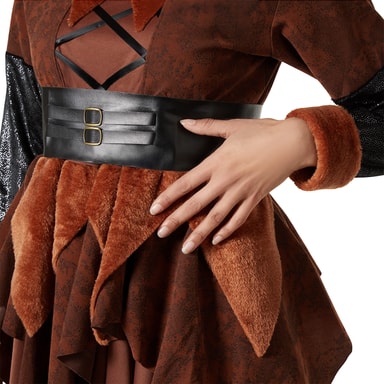 Den knälånga klänningen är bekvämt skuren och erbjuder en fantastisk blandning av stil och rörelsefrihet. Bältet framhäver din midja, medan huvudbonaden med päls och sina imponerande horn fulländar din look. Kombinera dräkten med pälsstövlar eller en yxa för att fullända din vikingastil.