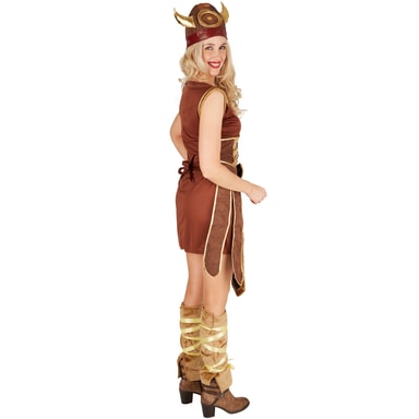 Maskeraddräkten Kvinnlig viking består av en klänning, ett förkläde, en hatt och benvärmare, material: 100 % polyester.Dra på dig den heta dräkten och förvandlas till en stor krigare från kalla Norden.Läs mer om produkten