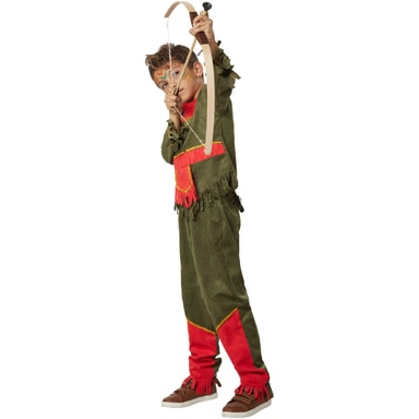 Den mockaliknande pojkdräkten Modig mohikan består av långa byxor med resår och fransigt mönster i ändarna. Nederdelen av byxbenen har en tyginsats fram som begränsas upptill med en gyllene bård. Även överdelen har dekorerats med fransar. Tyginsatser med gyllene bårder återfinns vid kragen och tvärs över magen. I mitten finns en lodrät tyginsats som avslutas med ett fransig mönster. Även de långa ärmarna pryds av en gyllene bård fram och avslutas med ett fransigt mönster, material: 100 % polyester.