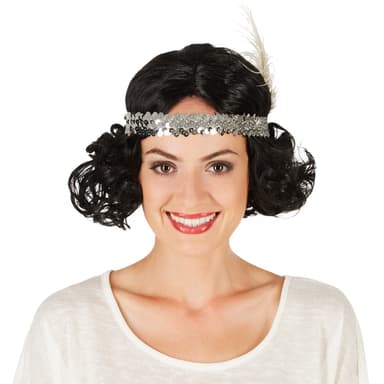 Gå tillbaka till 20-talet och dyk in i världen med Charleston och kabaré. Vår peruk med svarta lockar och ett silverfärgat hårband gör din drömlika look perfekt. Den idealiska peruken för vuxna, passar till alla dräkter på temat 20-tal, Charleston, kabaré, Broadway och burlesk. Oavsett om du använder den som pricken över i:et till en paljettklänning, matchande till en voluminös fjäderboa eller under cylinderhatten, Charleston-peruken är ett måste för alla som älskar 20-talet! Fler peruker, med eller utan pannband, samt passande dräkter till maskerad och halloween hittar du här i vår webbshop. Oavsett om du letar efter en dräkt för dam, herr eller barn: Ta en titt!