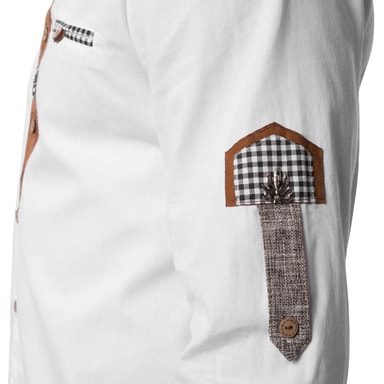 De många detaljerna gör herrskjortan Franzl mycket speciell. Knapparna i hjorthornsoptik sätter stilsäkra accenter. Den klassiska knappraden avbryts av en läderdetalj som är prydd med ett edelweiss-broderi och en edelweiss-platta av metall. På vänster sida finns en påsydd bröstficka. Ärmarna är i höjd med armbågen överdådigt dekorerade med ett rutmönster och en påsydd edelweissblomma i metall. Ärmarna kan rullas upp och fästas med en knapp, Material: 100 % bomull.