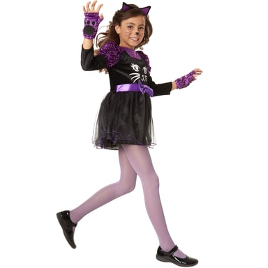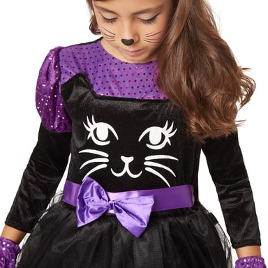 Den underbara flickdräkten Söt liten kelkatt övertygar framförallt med sitt detaljerade och lekfulla utseende. Den består av en klänning i ett stycke med en kjol i tre lager av tyll och satin, där de övre båda tyllkjolarna har lilafärgad fåll. Den påkostade överdelen med långa ärmar består till övervägande del av svart sammet och är framtill formad som ett katthuvud med vitt tryck i form av ögon, nos och morrhår. Ett påsytt band med en lila fluga delar av den övre delen från kjolen. Dekolletaget har en lila tyginsats med rosa prickar. Det anslutande axelområdet är av lilafärgad sammet med silvriga prickar. Ärmarna är av svart plysch. Dräkten knäpps med en dragkedja i ryggen. I slutet av dragkedjan finns en kattsvans med ståltråd i för individuell formgivning. Handskar med bara fingrar och hårtillbehör med kattöron gör dräkten komplett. Den handskarna är lila med silvriga glänsande prickar och svarta påsydda tassar, material: 100 % polyester.