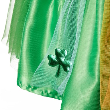 Accessoaren St. Patrick’s Day-ballerinakjol i nationalfärger är grön och har en vit, kontrasterande resår. Tyllkjolen är något kortare än underkjolen av glänsande satin. Över den finns gröna, vita och orangefärgade tyllränder applicerade. Två av dessa pryds av gröna treklöverblad, material: 100 % polyester.