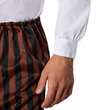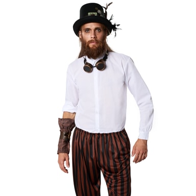 Herrdräkten Steampunk-äventyrare består av långa, randiga satinbyxor och mockaliknande stövelmanschetter. Överdelen består av en långärmad skjorta med knappar och krage. Den ärmlösa mockaliknande västen har även den knappar och antydda sammetsfickor, en guldkedja och en lackkrage. Ett bälte och en handledsvärmare hör också till denna outfit, material: 100 % polyester.