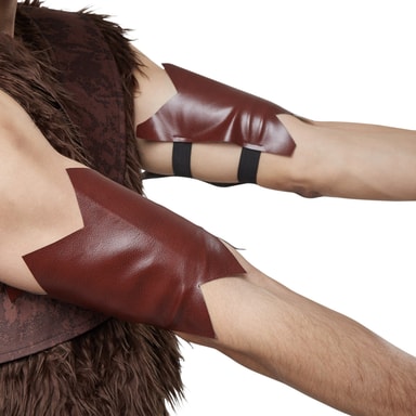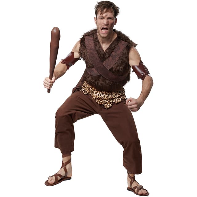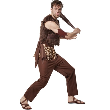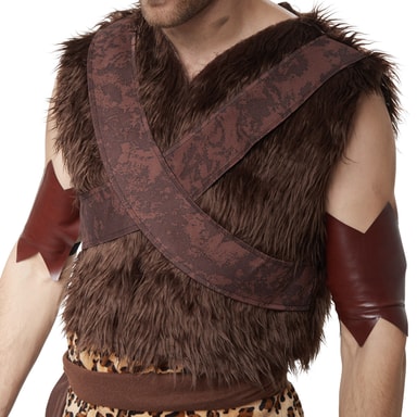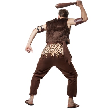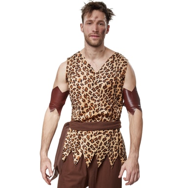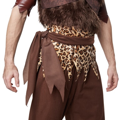 Herrdräkten Stenålders-klanchef består av tröja, slipover, byxor samt knytskärp och armmanschetter. Tröjan och slipovern är ärmlösa. Tröjan är lång, har leopardmönster och taggigt snitt nedtill. Slipovern som bärs under har en bräm av fuskpäls och två diagonala remmar av fuskmocka fram. Byxorna är långa med resår. Medföljer gör även ett brett knytskärp samt två armmanschetter med resår, material: 100 % polyester.