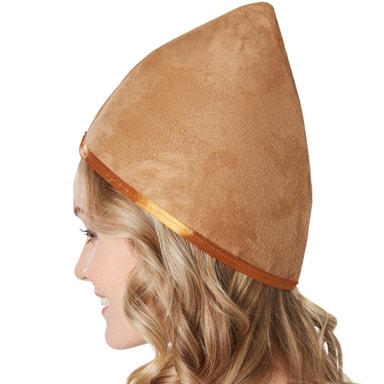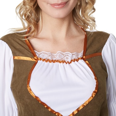 Damdräkten "Tjuvarnas drottning" består av en kort klänning och en hatt. Klänningen är vit med grå-bruna insatser av velour och brun satinfåll på kragen, ärmarna, förklädet och kjolen. Nedtill på ryggen finns ett resårband. Kjoldelen är kort framtill och lång baktill. Den korta underkjolen är av tyll. Den påsydda, ärmlösa rockdelen ovanför förklädet avslutas med ett mönster. Vid magen finns en antydd snörning. Den raka urringningen pryds av en spetskant. De långa ärmarna avslutas med velour, har slitsar på sidorna och resår i höjd med överarmen. Den spetsiga hatten av velour med satinkant gör dräkten komplett, material: 100 % polyester.