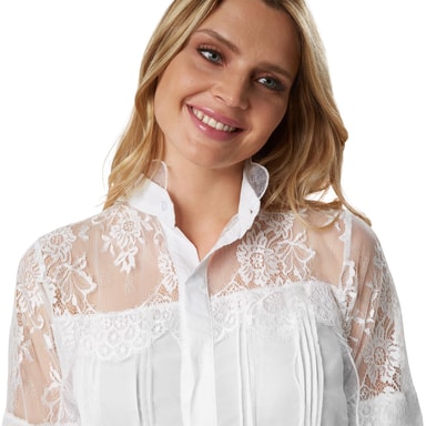 Den raffinerade traditionella blusen Lenerl imponerar med en mycket elegant design. Den övre delen av tylltyget är dekorerad med fin spets med blommönster. Spetsen avslutas med en bred spetsbård med sirliga fransar. Till vänster och höger om knappslån sitter två rader med veck och svängda tyllkantband. Den övre delen av de långa ärmarna täcks likt mittendelen av ett spetsmönster och avslutas med en spetsbård. De påsydda ärmsluten och kragen stängs med en knapp, Material: 100 % polyester.