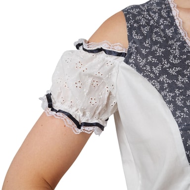 Tracht-blusen Zenzi har en traditionell men romantisk och lekfull design. Detta elastiska plagg har en perfekt passform. Blickfång är Carmen-halsringningen och det snygga frontpartiet med snörning. Tyginsatserna på sidorna har en kontrastfärg och är dekorerade med otaliga blommor. Tyget däremellan har ett blommönster och är rynkat med gummiresår. En vacker spetsbård betonar halsringningen. De korta ärmarna tar upp blommönstret igen. Gummiresåren upptill och nedtill på ärmarna ger ryschdetaljer på ärmsluten, som markeras av ett omgivande satinband och en spetsbård, Material: 100 % bomull.