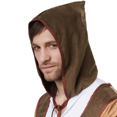 Herrdräkten Trofast dräng består av skjorta, väst, byxor, stövelmanschetter samt knytskärp. Den vita skjortan har en liten V-ringning och en påsydd spetsig huva med snörning av olivfärgad velour med brun kant. Skjortärmarna har ett förstärkt överstycke av velour med kardborreband och liten dekorsnörning. Den långa västen är av ljusbrun velour med olivfärgade insatser och förstärkta axelvaddar samt mörkbrun fåll. Nedtill har västen taggigt snitt till höger och vänster samt två dekorsnörningar. De långa, olivfärgade byxorna har linning med gummiresår och ljusbruna tyginsatser med brun kant på sidorna. Dräkten rundas av med stövelmanschetter av fuskläder med snörning, som fästs med gummiband, material: 100 % polyester.