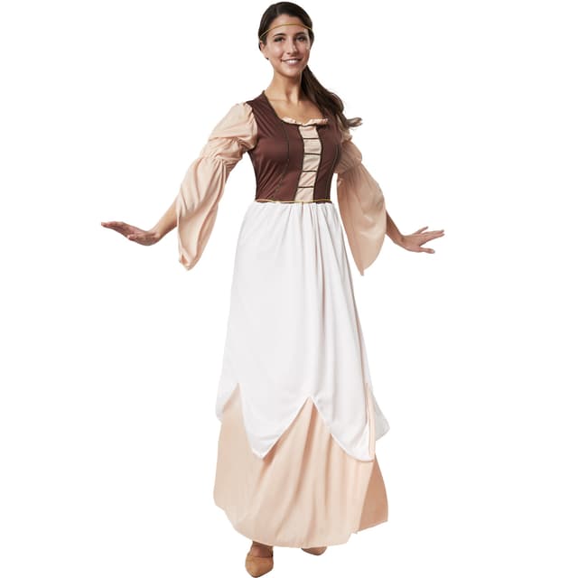 Damkostymen för den vackra mjölnarsdottern består av en nudefärgad klänning i ankellängd, med långa ärmar och ett påsytt krämvitt och slitet förkläde. De asymmetriskt skurna och brett utställda ärmarna har två resårer vid armbågen. Resten av överdelen är mörkbrun med en antydd korsett med nudefärgad insats. Den ryschade halsringningen är nudefärgad och precis som byst- och bukområdet försedd med en dekorativ bård i svart och guld. Kostymen får ytterligare stöd med den elastiska linningen i midjan. Den medföljande guldfärgade dragskon knyts ledigt runt magen, material: 100 % polyester.