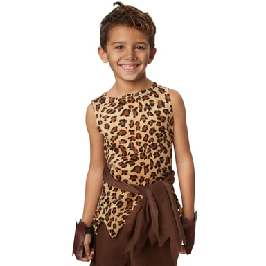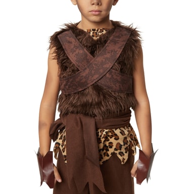 Pojkdräkten Vild stenålderspojke består av enfärgade, långa byxor med resår och en ärmlös väst med fläckigt mönster. Över detta bärs ytterligare en väst, mockaliknande med fuskpälsbräm och två diagonala remmar fram. Medföljer gör även en bred midjegördel som knyts ihop samt två armmanschetter med resår, material: 100 % polyester.
