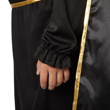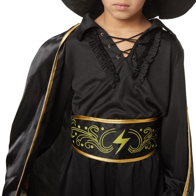 Pojkdräkten Zorro i enfärgad satin består av 6 delar. De långa byxorna med elastisk linning har samma mönster och gulfärgade kantband som maggördeln. Överdelen har en krage med snörning och ryschmönster på båda sidorna. Den främre delen av de långa ärmarna har försetts med resår och är trumpetformad, vilket ger en ryscheffekt. Den långa capen har en gyllene rand och stängs med kardborreband på överdelens baksida. Den karaktäristiska hatten och det berömda filt ögonskyddet i filt gör outfiten perfekt, material: 100 % polyester.