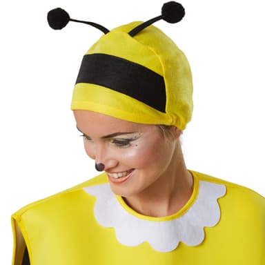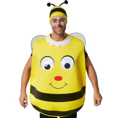 Uni6dräkten Cartoon-bi, i en storlek som passar alla, består av en poncho med kardborreband bak. På framsidan finns stora påsydda plastögon och en tryckt näsa, mun och tryckta svarta ränder. Kragen har en vit, rundad kant. Tygmössan har en svart rand och två känselspröt, material: 100 % polyester.