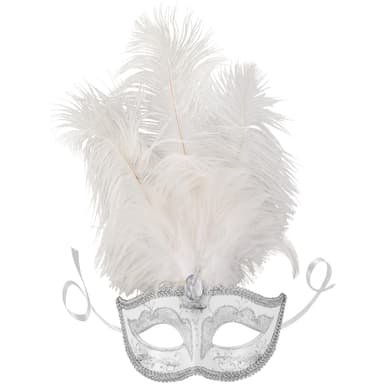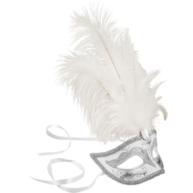 Denna venetianska mask med fjädrar är en praktfull accessoar. Även på avstånd drar de imponerande fjädrarna med den stora prydnadsstenen nedtill allas blickar till sig. De glittrande dekorationerna och utsmyckningarna ger den här ädla accessoaren ytterligare charm. En dekorativ bård omger halvmasken och skapar en vacker avslutning. Med de två smala satinbanden kan den bekväma masken anpassas till varje huvudstorlek, Material: Plastmaterial, polyester, strutsfjädrar.