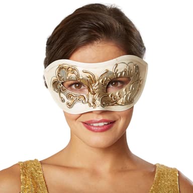 Denna venetianska mask med ornament ger ett hemlighetsfullt och mystiskt intryck. Den vackert formade accessoaren lämnar tillräckligt med utrymme för ögon och näsa och döljer samtidigt din identitet. De vackra utsmyckningarna med skimrande matt yta sticker ut mot den enfärgade masken. Genom det elastiska gummibandet kan halvmasken enkelt bäras av varje huvudstorlek, Material: plast, polyester.