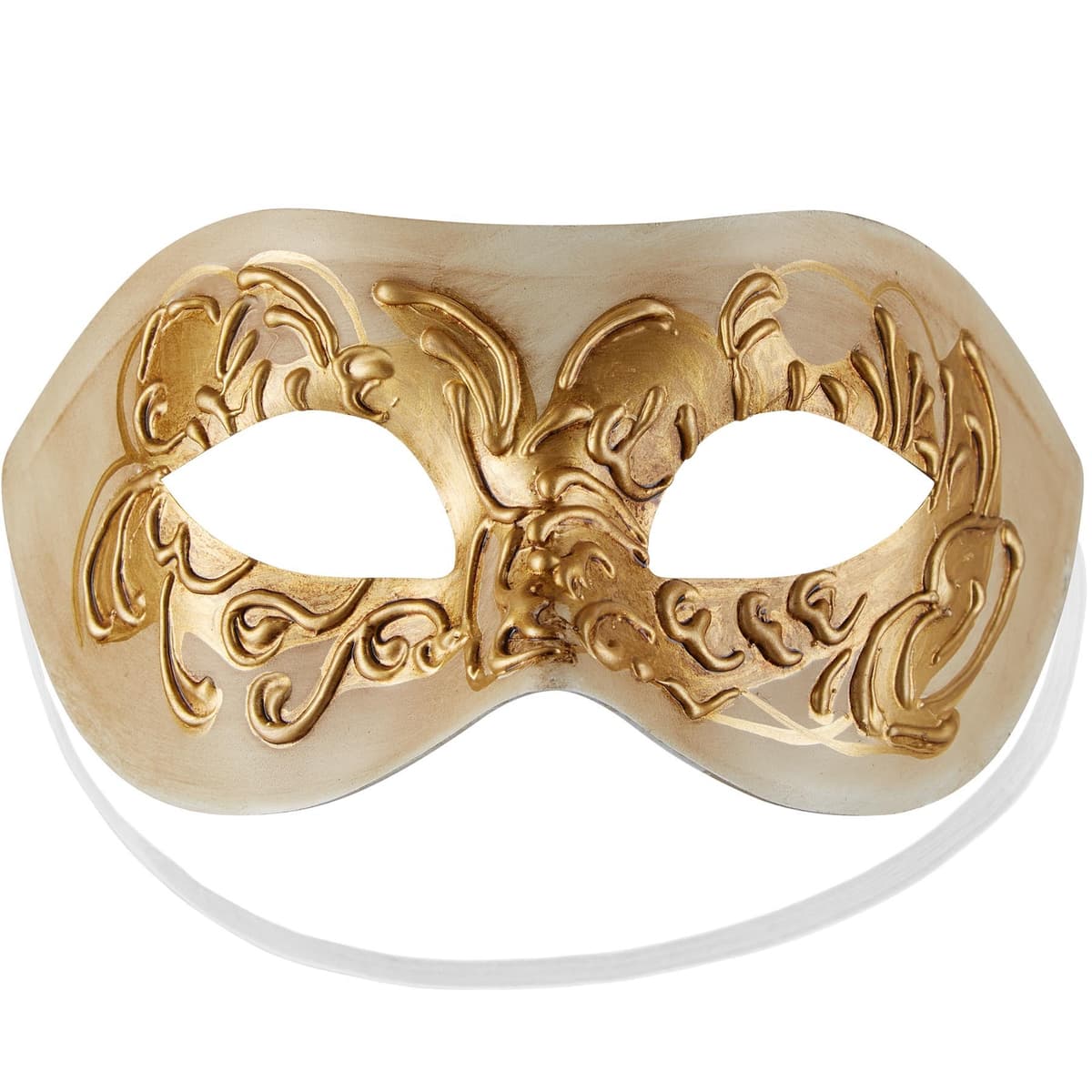 Denna venetianska mask med ornament ger ett hemlighetsfullt och mystiskt intryck. Den vackert formade accessoaren lämnar tillräckligt med utrymme för ögon och näsa och döljer samtidigt din identitet. De vackra utsmyckningarna med skimrande matt yta sticker ut mot den enfärgade masken. Genom det elastiska gummibandet kan halvmasken enkelt bäras av varje huvudstorlek, Material: plast, polyester.