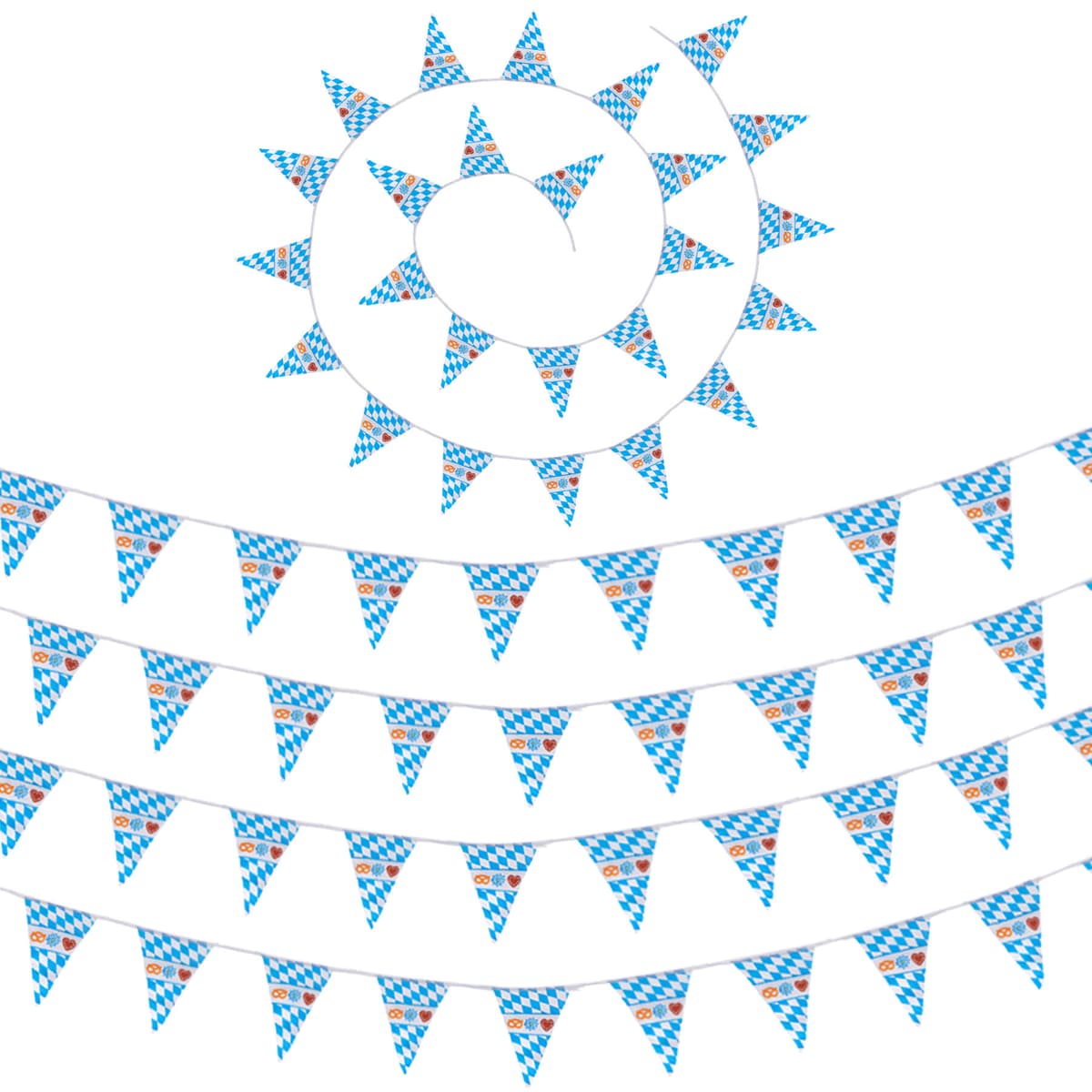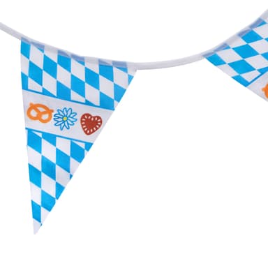 Vimpelgirlangen med blå-vitt romboidmönster och olika motiv ger ditt party en verklig Oktoberfest-känsla. Den ljusa, stabila dekorationen i de bayerska färgerna kan enkelt hängas upp och användas. De vackra, stora vimplarna är jämnt skurna och fastsydda i toppen. Hela girlangen är tillverkad av väderbeständigt material och passar utmärkt för en fest under bar himmel, Material: 100 % polyester.