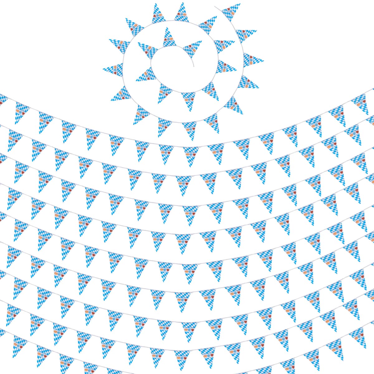 Vimpelgirlangen med blå-vitt romboidmönster och olika motiv ger ditt party en verklig Oktoberfest-känsla. Den ljusa, stabila dekorationen i de bayerska färgerna kan enkelt hängas upp och användas. De vackra, stora vimplarna är jämnt skurna och fastsydda i toppen. Hela girlangen är tillverkad av väderbeständigt material och passar utmärkt för en fest under bar himmel, Material: 100 % polyester.
