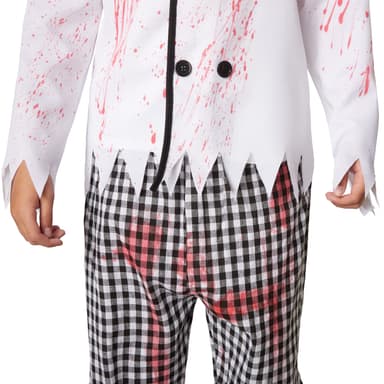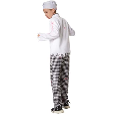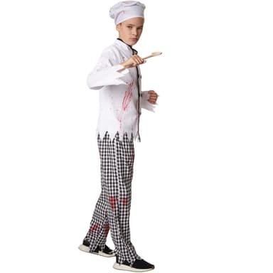 Pojkdräkten Kuslig kock består av en vit kockrock med den typiska dubbla knappraden och en svart kontrasterande krage mitt fram som sträcker sig hela vägen ner. Till detta medföljer matchande byxor med svartvitt rutigt mönster. Byxorna har linning med resår. På ärmarna och fållen på överdelen samt nedtill på byxorna är tyget fransigt. Den medföljande kockmössan med resårinsats och kockförkläde med snörning gör dräkten komplett. Alla delar av dräkten är nedfläckade med blod, material: 100 % polyester.
