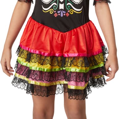 Flickdräkten Kuslig mexikanska består av en ärmlös kort klänning. Överdelen har detaljerat tryck, färgglada dekorationer, ett stort skelettmönster och ett hjärta på vänstra bröstet. Kjolen har ett snitt i tre lager med en rand av glänsande satin och spets i ändarna. Det medföljande halsbandet knäpps med kardborreband. Det är tillverkat av svart, veckat tyg och pryds av ett rött satinband. Handledsvärmarna är i svart spets med röda resårkanter. Ett diadem med färgglada blommor och svart spetsslöja gör denna kusliga miniklänning komplett, material: 100 % polyester.