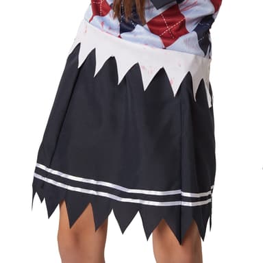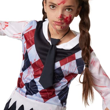 Den tredelade flickdräkten Kuslig skolflicka består av en överdel, en kjol samt en slips som fästs med resår. Överdelen är tillverkad i ett stycke. Blusen med påsydd rutig slipover är fransig vid ärmarna samt vid fållen. Den typiska bluskragen och hela överdelen är nedfläckade med blod. Kjolen med resår är också fransig vid fållen och har två vita påsydda dekorband nedtill, material: 100 % polyester.