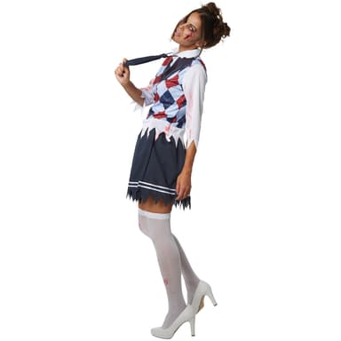 Damdräkten Kuslig skolflicka består av en slipover-liknande överdel med rutigt mönster. De påsydda skjortdelarna är fransiga på ändarna och med blodstänk. Den tillhörande kjolen med resår har påsydda ränder i två rader på fållen och är även den fransig. För en speciell look innehåller dräkten en kravatt med resår som kan hängas runt halsen samt knästrumpor med blodstänk, material 100 % polyester.