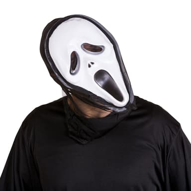 Herrkostymen Skriet Halloween består av en kuslig mask och en lång helkroppsdräkt i svart. Material: 100 % polyester.