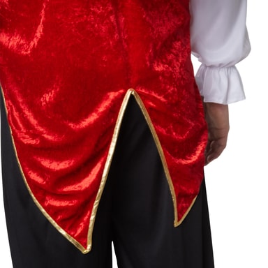 Kläderna gör människan. Det vet också denna Förnäma Vampyr. Med sin eleganta kombination av svarta byxor, ljusröda sammetsöverdel med långa vita ärmar och den lekfulla korta capen, förstärker han skickligt effekten av sitt dramatiska utseende. Den fina jaboten sätts snabbt på och sedan är det klassiska utseendet för en förnäm vampyr perfekt.