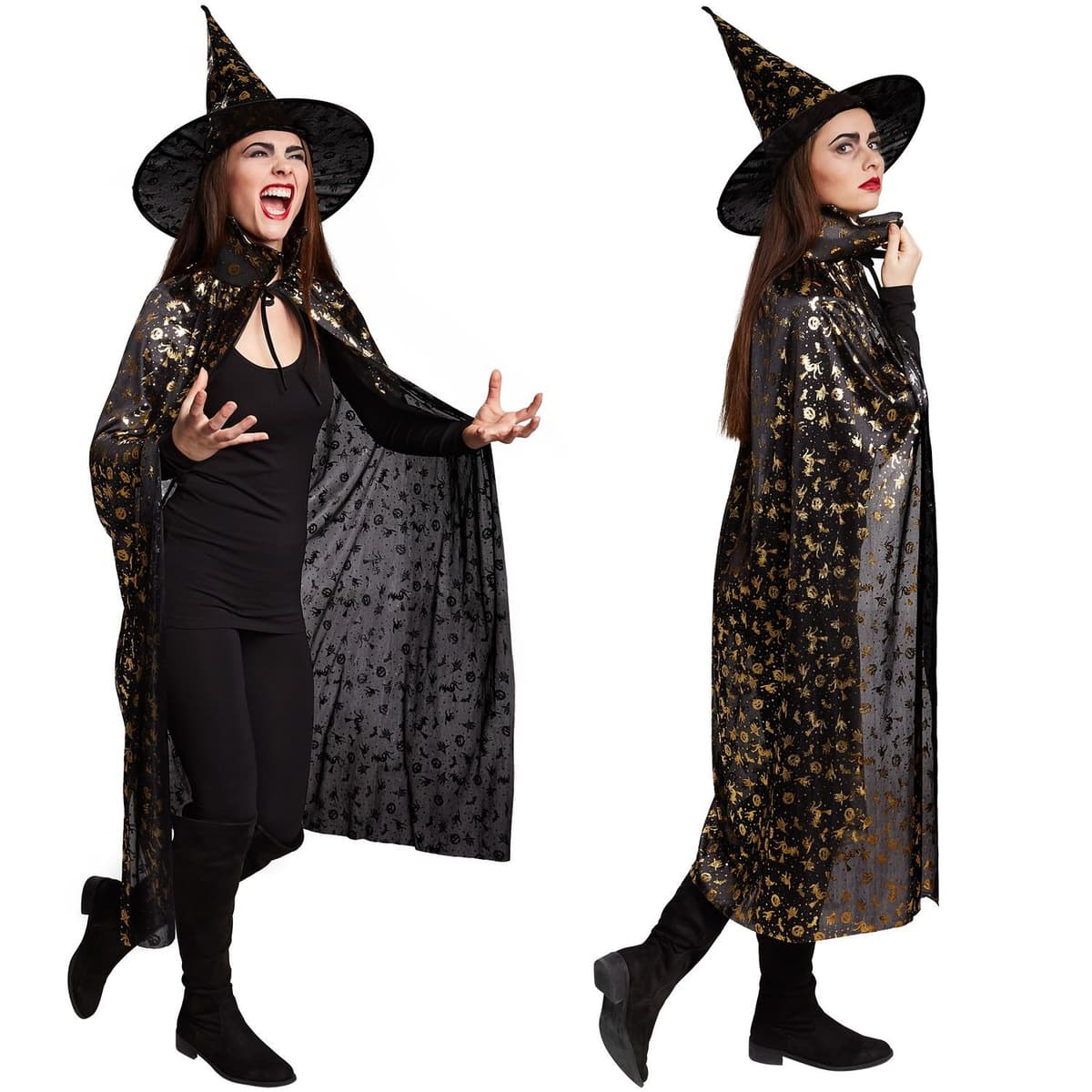 Setet består av en vacker hatt och en stilig cape med guldfärgat halloween- och pumpa-tryck, material: 100 % polyester.